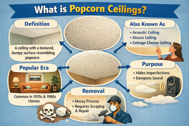 Popcorn ceilings are a textured ceiling finish made to create a rough, speckled surface overhead. Some people call them stucco ceilings, acoustic ceilings, stipple ceilings, or textured ceilings. The texture can be light and fine in one home and much heavier in another, depending on when it was applied and how it was sprayed or rolled on.
